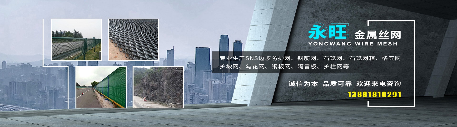 服務(wù)熱線: 成都市永旺金屬絲網(wǎng)有限公司是一家研發(fā)、生產(chǎn)、加工、銷售為一體的責(zé)任制企業(yè)公司。本公司“以誠信為本、以服務(wù)社會已任、以科學(xué)創(chuàng)新為理念”。 專業(yè)生產(chǎn)SNS邊坡防護網(wǎng)、鋼筋網(wǎng)、石籠網(wǎng)、石籠網(wǎng)箱、格賓網(wǎng)、護坡網(wǎng)、勾花網(wǎng)、鋼板網(wǎng)、隔音板、護欄網(wǎng)等。產(chǎn)品主要運用于鐵路,高速公路,橋梁,隧道,機場,礦山,河道,球場,碼頭,港口等多個領(lǐng)域。 本公司期待與您長期合作,希望與您共創(chuàng)輝煌,我們愿與各業(yè)朋友精誠合作,共創(chuàng)美好未來,希望各業(yè)朋友來函來電